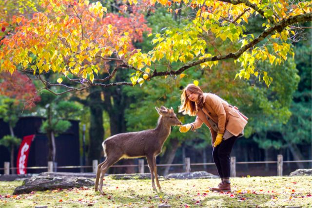 Pasear por Nara es un verdadero placer. Es una ciudad tranquila que combina perfectamente la tradición en forma de templos con la modernidad y la naturaleza. Mientras caminas por el parque principal lleno de ciervos que deambulan, puedes acercarte a estas hermosas criaturas y alimentarlas.